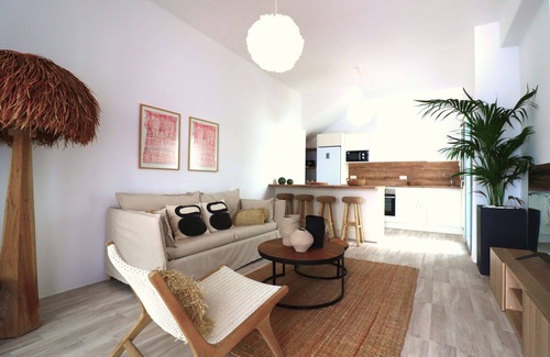 Two spaces are set up for your meals, one inside and another outside. This brand new apartment is carefully furnished with quality materials and natural tones.
