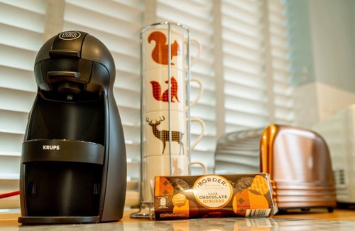 The kitchen has a fridge, a hob, an oven, a toaster, a kettle, a coffee maker, a freezer and a microwave.