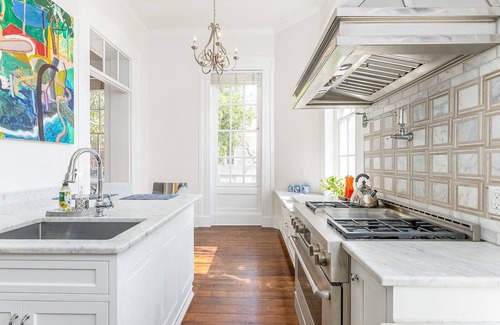The grand exterior staircase leads up to the second level entrance, which is deemed the parlor level here in the south. You'll find that the open floor plan on this level is an entertainers dream! The open gathering room and dining room create an inviting and intimate space, perfect for entertaining while enjoying mesmerizing views of Pulaski Square where you'll be transported through time. The kitchen is situated just at the back of the home, with high-end finished and appliances, such as marble countertops, a gas-range, and everything you need to prepare meals.
