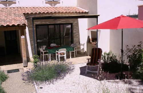 Gardens : Both the front and back gardens are gravelled and planted. The back, which overlooks the village and mountains beyond, is ideal for breakfast in the sun (or shade if you prefer!) There is a shaded terrace at the front, complete with table and chairs, large sun umbrella, reclining armchairs and a built-in barbeque, perfect for a relaxing evening supper with family or a romantic dinner in the dying rays of the summer sun.