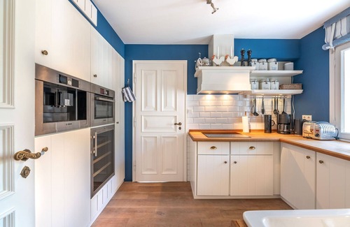 The 146 m² representative first floor of the Kommandeur Haus has a beautifully furnished living room with an antique tiled stove and a fully equipped kitchen in a cozy country house style. The adjoining dining room with its historic ceiling paintings impresses with a direct view of the extensive garden. There is also an idyllic and cozy fireplace room and two bedrooms on the first floor. On the upper floor, which extends over an area of more than 100 square meters, a total of 3 bedrooms offer enough space for guests. The well equipped bathroom and an infrared sauna provide wellness moments. A light-flooded office for undisturbed work and a wonderful leisure room for yoga or family table tennis offer space to meet a wide range of needs. The lush garden of over 1000 square meters is sheltered from view and has a furnished terrace with sun loungers and a beach chair.