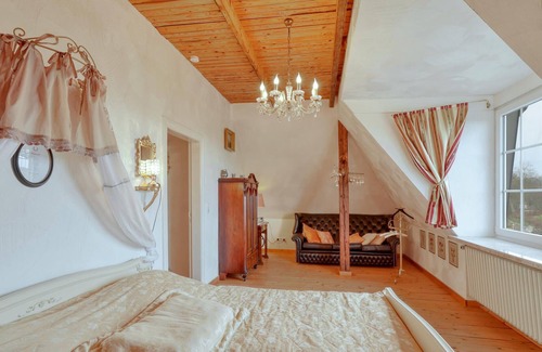 In the north wing towards the courtyard square is the 2-story "Maisonette Suite" with separate entrance area for up to 5 adults and a small child. In the entrance of the suite there is a large wooden staircase leading to the bedrooms on the 1st floor. On the first floor is the large panoramic room with kitchen and dining area overlooking the garden. The living room right next door is openly divided into two areas. A reading or TV room and a small study with a desk and the fireplace. From there you have a beautiful view of the fountain of the garden. In the attic are the 3 bedrooms, all with a beautiful view of the landscape behind the dike.