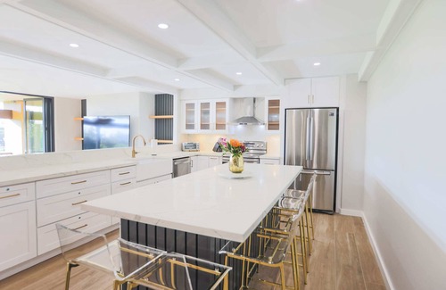 Your Maui Villa is located within the gated community of Ka'anapali Royal! You are greeted as you walk in with a spacious open floor plan that welcomes you into the heart of the home - the elegant kitchen with oversized island and plenty of seating for the whole group! The kitchen boasts expansive golf course views and is fully equipped with everything you will need including an additional beverage refrigerator for all your favorites!