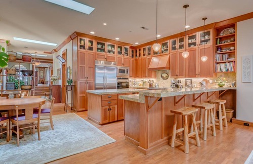 The great room includes a large open kitchen with island, bar and table seating with Wolf gas range and ovens. The kitchen comes complete with appliances, cookware, china and glassware.