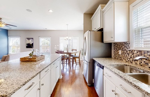 Upon entry, you'll be met with a bright interior and a cozy atmosphere throughout the well-appointed living area. This beautiful corner-lot home boasts a desirable layout and tasteful design, full of natural light. The front room is a spacious dining room, perfect for family dinners and group gatherings. The hallway opens up to an open-concept floor-plan living area, an oversized kitchen island with extra seating, an eat-in kitchen area, and a comfortable living room all combined. The kitchen features plenty of granite countertop space, a huge walk-in pantry, a gas stove and stainless steel appliances. Comfortable beds in spacious bedrooms ensure everyone receives a wonderful night's rest from the day's adventures. The main bedroom's bath features a walk-in shower, garden tub, double sink vanity, and a large walk-in closet. A laundry room with full-size washer and dryer and a full hallway bath completes the upstairs. The private backyard is fully fenced and provides access to the detached garage and driveway.