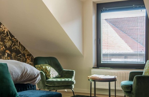This renovated square farm can accommodate groups of up to 8 people, which is ideal for several families or a group of friends. The view of the underlying fields with a summer sunset is downright impressive.