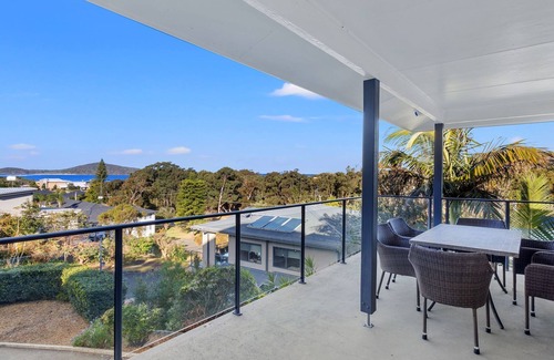 'Island View' boasts sweeping views over Fingal Bay beach and Fingal Spit, large family home with six bedroom and located only a few minutes' walk to Fingal Bay patrolled beach which is perfect for the kids to swim, Fingal Surf Club, Fingal Sports Club, and Fingal Bay main street where you will find a general store, café, takeaway shop, bottle shop and service station.