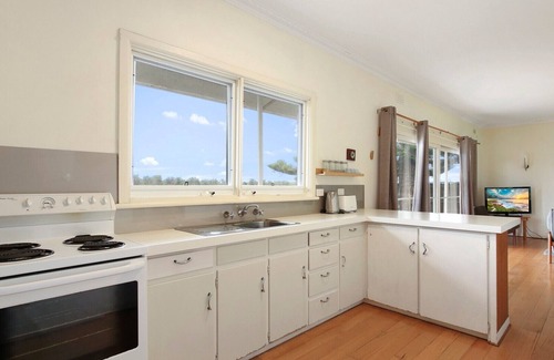 The property accommodates up to five guests across two bedrooms: one with a queen bed and the other with three single beds. It features a fully equipped kitchen, a bathroom with a walk-in shower and separate toilet, and a top-loader washing machine. Amenities include a 4-burner gas BBQ, TV, CD player, and reverse cycle heating and cooling. Guests can enjoy a large yard with absolute water frontage and ample parking for two cars and a boat trailer. Please note, the property enforces a strict no-smoking, no-pets, and no-party policy.