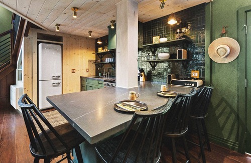 The kitchen is a standout feature of the cabin. Custom green tile stretches to the ceiling, complemented by sleek black counters, open shelving, and a trendy Smeg fridge. Together, they create a stylish and functional space. The counter seating is perfect for enjoying meals together.