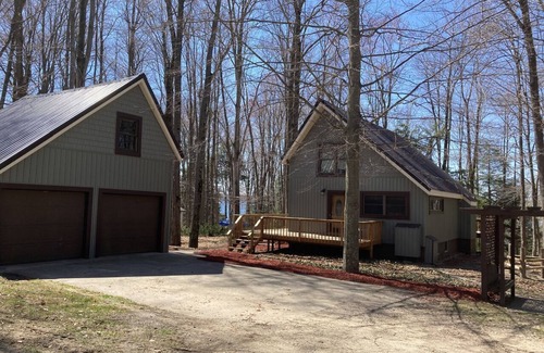 Kalkaska Getaway is a 3-level home: Main floor (with GE kitchen appliances), upstairs bedrooms and a walk-out basement that is geared for fun with a shuffleboard table, foosball table and air hockey table for your enjoyment! Although you can barely see the lake in the summertime from this property, you are only a 150 yard walk to the water, where you can swim, lounge around, or launch a kayak. Manistee Lake is a shallow lake, and from the shore has a gradual slope so it is great for smaller kids (max depth is 16 feet). Kalkaska Getaway is located on the northeast corner of the lake.