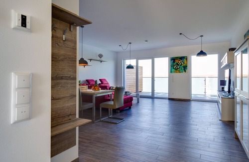 "Kapitänskajüte", 2-room apartment 55 m2. Bright, cosy furnishings: living/sleeping room with panoramic window with 1 sofabed and satellite TV (flat screen), radio. Exit to the balcony. 1 double bedroom. Open kitchen (oven, dishwasher, 4 ceramic glass hob hotplates, electric coffee machine). Shower/WC. Heating. Balcony. Balcony furniture. View of the port. Facilities: safe, children's high chair, baby cot (extra), hair dryer. Internet (WiFi, free). Parking at the house. Please note: non-smokers only. Smoke alarm. Wohnung im Erdgeschoss oder im Obergeschoss.