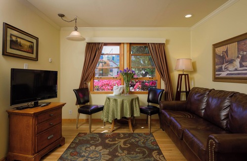 The suite features a king-size bed with plush bedding designed for a restful night’s sleep. Large windows look out over the courtyard, bringing in natural light and offering a view of our flower-filled gardens. Guests enjoy the convenience of their own garage located directly beneath the room, ensuring parking is simple and stress-free throughout their stay. Inside, you will find a cozy living area with a comfortable couch and flat-screen TV, as well as a dining nook by the window that makes an excellent spot for morning coffee or a glass of wine in the evening. For additional flexibility, a rollaway bed can be placed in the sitting area, providing an extra sleeping option for families or small groups. The private bathroom is accented with hand-painted tilework and includes a walk-in shower along with eco-friendly toiletries. High-speed Wi-Fi is available, making it easy to work or relax online during your stay. Pets are also welcome in this King Suite, making it a convenient choice for those traveling with their four-legged family members.