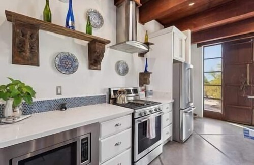 Surrounded by a variety of cacti, the cutest quail running around, rabbits hopping about the property an all variety of Birds. Step outside to enjoy the casita’s private outdoor space, Relax on the patio with a morning coffee, dine alfresco under the stars, or simply take in the serene desert views.