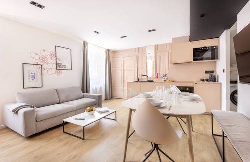 This charming duplex apartment, located in the backyard building, is an ideal accommodation for a quiet stay in the heart of Vieux Lille. Its atypical layout makes it perfect for people looking for comfort and absolute calm. On the upper floor you will find a separate bedroom and a bathroom. Below lays a large room with an additional queensize bed, an equipped kitchen and a dining area. Large Smart TVs in each room will please Netflix lovers !