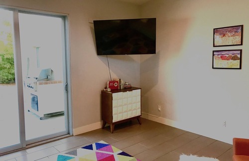 Living room: large open area with midcentury furnishings, 55 inch TV wall mounted on swivel & connected to WIFI for streaming.