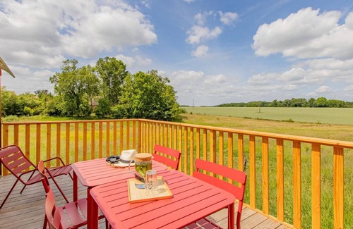 Passionate about nature and the environment, Delphine & Jérôme welcome you to an unusual caravan located in a quiet area, on the edge of the meadows (including a mini pasture welcoming their two donkeys in season), well "out of the way" on their small family farm producing fruits & vegetables in "agroecology" (also housing a small chicken coop & their artisanal carpentry workshop). Total tranquility in the heart of a peaceful little rural hamlet, in the heart of the Bresse countryside in the hollow of a soothing preserved setting of nature & greenery (protected in ZNIEFF for its fauna & flora riches), vast rolling plain of fields of crops & meadows dotted with numerous ponds (partly protected for their exceptional biotopes, particularly ornithological, sheltering very rare species), a stone's throw from a large wild forest. Ultra-relaxing setting and location, not far from the banks of the Doubs (a true kayaker's paradise and a renowned fishing spot for its famous catfish, pikeperch, and carp), remarkable ecosystem, partly protected as a "Natura 2000 Zone" for its exceptional bird sanctuary rich in 160 species and its very rare plant varieties. A very comfortable, enveloping "cocoon" with a warm, wooded country feel. A vast panoramic balcony-terrace offers a splendid unobstructed view of the surrounding countryside, complemented, "on the courtyard side," by a second large, exposed and flowery terrace lined with cherry trees (picking possible). Composition: Completely independent caravan next to the owners' house (total independence). Electric heating. Raised ground floor (4 steps): living room with equipped kitchenette (2 induction hobs + combined grill/microwave oven + refrigerator) and sleeping area (sofa with 2 single beds 90x190cm, convertible into a double bed 180x190cm), cabin bedroom (double bed 140x190cm), shower room (shower/WC in "dry toilet"). Balcony-terrace + terrace + courtyard + private parking. Supermarket & small shops 8 km.