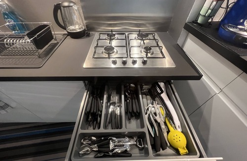 The kitchen is equipped with an oven, a stovetop, and a refrigerator, as well as a coffee maker, an electric kettle, and a microwave. Connect to the WiFi, or get cozy in front of the TV. Bathroom amenities include a hair dryer and towels. And you can even travel light because you'll have access to laundry facilities. Other amenities at this 2-bedroom, 1-bathroom rental include a living room and bed sheets.