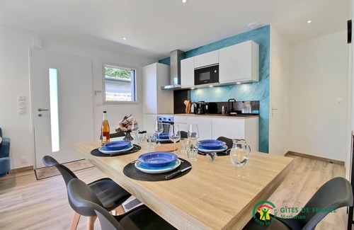 This contemporary and independent holiday home is laid out on one level. It offers you: a large living room with kitchen, living room and lounge, 2 bedrooms (2 180x200 beds that can be converted into 90x200 beds), a bathroom with toilet (communicating to the 2 bedrooms), a laundry room and a separate toilet. with washbasin. Outside: an equipped wooden terrace and a gravelled courtyard with parking space. Next to the cottage is rental 56G5823 (4 people) and the owners. Between Vannes and Nantes, between the Rhuys peninsula and the Guérandaise peninsula, come and recharge your batteries in Férel for your next vacation. La Vilaine will allow you to practice water sports (sailing, canoeing) and boat trips. For your beach days, Pénestin with its 25 kilometers of coastline and its dozens of beaches - including that of La Mine d'Or - is the ideal place! Less than 30 minutes away, the Brière, the salt marshes and the Gulf of Morbihan will be within your reach.