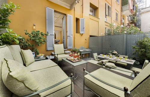 Decked and dual-level furnished terrace to the rear of the building with a private dining area below and a chill-out area above – what a treat after a busy day exploring the world’s design and fashion capital!
