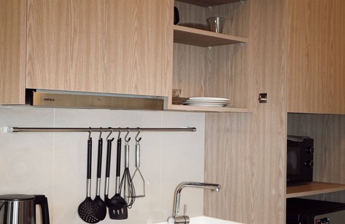 Full kitchenware, microwave, refrigerator, kettle & toaster