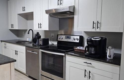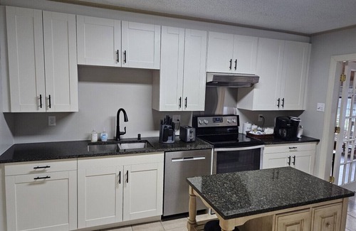 Through this room, is a fully equipped kitchen where you can have fun spending time and cooking or you can take the meal prep outside and make your favorite meal on the wood pellet/propane gas grill. While you’re at the culinary works, you won’t want to forget about the beverages. Don’t let your inner barista or bartender go unfulfilled, be sure to take advantage of the fully stocked coffee station and cocktail/mocktail corner. Enjoy a meal at either of the two indoor dining tables (each seating 6) or feast outdoors overlooking the water, at the patio dining set in the gazebo. You can even set up a buffet or cocktail style at one of the picnic tables along the edge of the yard. The mealtime possibilities are endless.