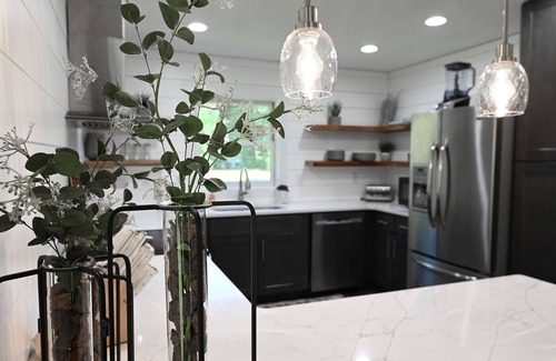 The kitchen is fully furnished and features custom quartz counter tops, stainless appliances, Keurig coffee maker, and so much more! Dine inside in the dining room, or outside on the new custom patio facing the canal!