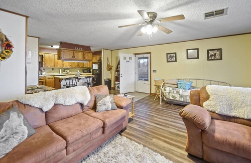 Our 2 Bedroom "The Peak" is a romantic getaway favorite. Enjoy a beautiful view of the lake from inside the home or the large covered porch. The home has a fully equipped kitchen with electric stove and cooktop, microwave, double sink, refrigerator/freezer, bar top, small dining area, AND beautiful covered porch for relaxing outdoors! With a queen-sized bed in each bedroom and a day bed with trundle in the living room, there is plenty of room for a party of 6 to comfortably enjoy their stay. The bathroom offers a full-sized shower/tub, with an attached laundry room available for your use. There is a large yard to play games, a gas grill is included for barbecuing.