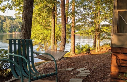 Adorable home directly on lake with dock access. 2 full beds and TV's in each bedroom. Large wrap around sofa . The home is small but the amenities are endless. Screened in porch with swing and rocking chairs. Outside deck with bistro lighting and dining and grill. Separate firepit and hammock area. End of float dock is perfect for swimming and fishing. Kayaks and life jackets are included.