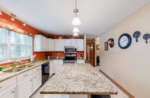 Never let the lake out of sight while relaxing on the screened porch. Detailed with comfortable lounge seating, a foosball table, and ceiling fans, this indoor/outdoor space also features a dining table that is perfect for enjoying alfresco meals. Step inside to a welcoming living room with vaulted ceilings, an air hockey table, and comfortable sofas surrounding a TV. Whip up crowd-pleasing recipes in the well-equipped kitchen featuring a center island with seating and a full suite of appliances, while the sunlit dining room boasts more serene lake views. Central air-conditioning offers ultimate comfort and the washer/dryer adds convenience during your stay.
