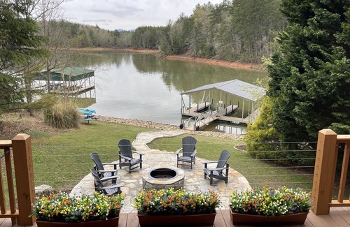 Why we chose this home. Beautiful wooded lot in a quiet, deep water cove with almost no boat traffic. It is completely “tranquil”. The home has windows that overlook the lake from the kitchen, eating area and main floor and upstairs kings. The porches are wonderful and provide that family gathering space. We have a lower deck with furniture, large screen TV that flows straight to our lakeside fire pit and path to double slip dock with swim platform.