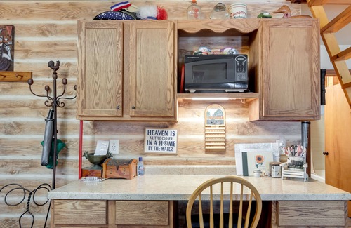 - NOTE: This multi-level cabin requires using an outdoor staircase to enter. While it offers a full bath on the main level, interior stairs are required to access all of the bedrooms located on the upper and lower levels
