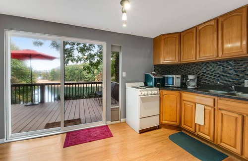 Vacation memories await you at this lakefront home in Jefferson City! Guests can enjoy the covered, furnished deck from the back door or venture down by the water for a covered patio, dining table, and firepit. You'll love the private boat dock and easy access to the lake while grilling up family meals on the gas grill. Inside, there's a wood-burning fireplace and a TV equipped with Direct TV and high-speed internet.