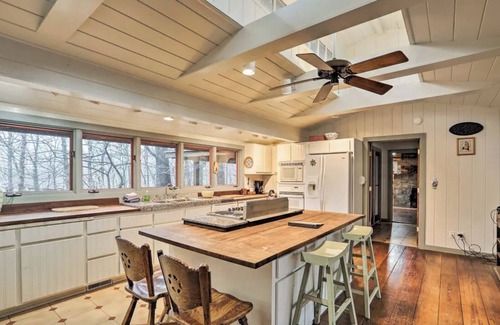 Light-filled kitchen with central island. Living room in 1910 cabin with decorative fireplace. Large wrap-around porch with chairs for relaxing, socializing and gazing intot forest. Basketball hoop. Fire-pit. Grill. Optional detached art/music studio with room for beds (additional fee required). Longtermers (more than one week) require weekly cleaning service, separate rental contract and security deposit.