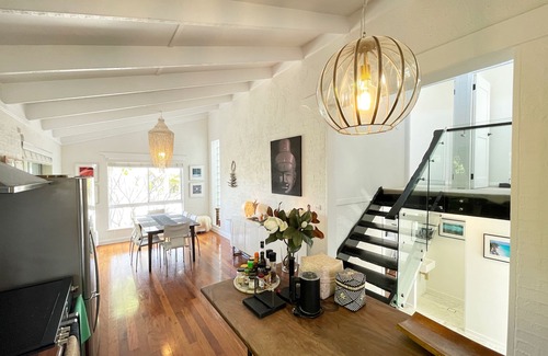 This large, high vaulted ceiling home, has character and charm, modern amenities with Byron Charm, decorated with artifacts from different cultures, great reading materials, luxurious furniture and a fully equipped cooks kitchen (including spices, oils, and teas). It is the perfect mix of modern meets Byron charm, the home is solid double brick, double storey, it is spacious, open and it's multi levels and sunken lounge area make it an interesting and very comfortable grounded homely space.
