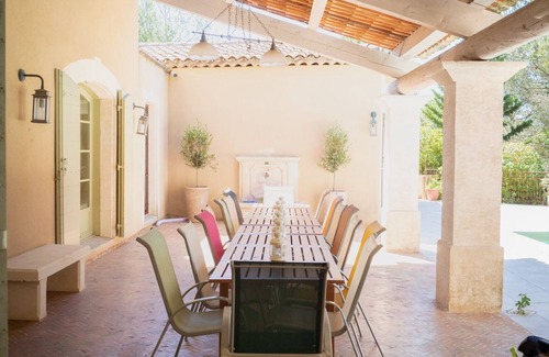 In the heart of Provence, the villa is ideally located to visit Provence and for golf lovers : Golf course is accessible upon reservation, please check out the website of Golf International de Pont-Royal en Provence for all info), 30 mn drive or less from major cultural and sightseeing tourist sites such as: Saint-Remy and les Baux de Provence in the magnificent regional park of les Alpilles, Arles or Avignon, by the regional park of Luberon, Aix-en-Provence, and 40 mn from Marseille and The famous Mediterranean Calanques and beaches,or the National park of La Camargue with its long beaches and wilderness. Calanques Beaches are 40 mn away, Cassis less than 1 hour . Featuring premium amenities with huge spaces and magnificent panoramic views, this exceptional upscale villa is located only at a 3-mn walk from the village center, with a small grocery store or convenience shops, restaurant and bars, and it offers upscale premises. The ideal place for a large family get-together or groups of friends to visit Provence, corporate retreat/seminars, to play Golf or bike-ride along the numerous crowdless and unused small country roads of Provence. It offers high-end features and a relaxing and calm atmosphere, large dining room table seating 14, and 18 (outside, on the terrace facing the pool), a large kitchen, 3 TVs , 2 living rooms, 1 billard room, 1 fitness room, sauna, pool-side Barbecue space, panoramic views on Golf course and countryside hills, 1 large petanque field, huge spaces and relaxing environment views in a calm and secluded place inside a 24/7 gated Golf community with excellent security services. Property and its 3000m2 garden includes a Petanque playground. and a 6-vehicle convenient private parking space ( up to 7 cars can be squeezed in).