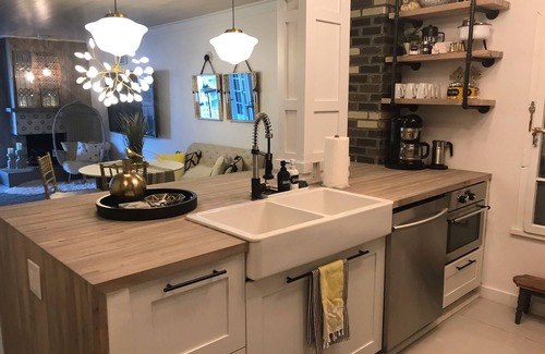 The kitchen features a waterfall butcher block counter, Italian tile, an induction cook top, a farmhouse sink, custom cabinets, and a coffee and espresso bar with all of your coffee needs.