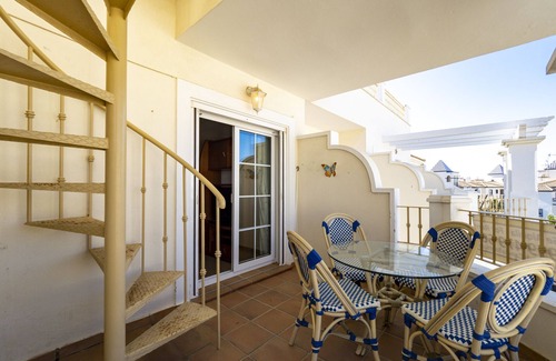 This duplex apartment in Punta del Moral has 2 bedrooms and capacity for 5 persons. Homelike apartment of 80 m² offers a balcony leading from the living room with a spiral staircase leading to a large terrace on the roof. Located at the beach, It has views to the beach and across to Isla Cristina. It is located 50m from the beach, 100m from various shops restaurants and bars and only 3km to the local golf course. The accommodation is equipped with the following things: elevator, terrace, iron, electric heating, communal swimming pool, covered car parking in the same building, tv, stereo.The vitroceramic independent kitchen, is equipped with refrigerator, microwave, oven, freezer, washing machine, dishwasher, dishes/cutlery, kitchen utensils, coffee machine, fryer, toaster.