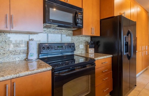 -Fully equipped kitchen with granite countertops, full-sized refrigerator, dishwasher, and all amenities you need, including plenty of storage space.