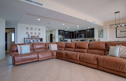 One of a kind in Las Palomas. Share the 11th floor with only 2 other condos in Phase 1. Penthouse level with larger patio than typical 3bdrm. When you first open the door all you see is ocean, as you enter the back patio, the entire complex can be viewed and all the action. 3 King beds/2 with bathroom suites and 1 main bath for 3rd bedroom. Queen sleeper sofa. Fantastic ocean views and desert views with no building obstructing the front or back of Rubi. Newly furnished and remodeled. Large kitchen with open layout to great room. Enjoy your large ocean view while preparing your meals or dining with friends. This beauty features views of the desert, golf course, Cholla Bay, and Puerto Penasco and community on the entrance side (no condos to block your views), and a large semi-circle patio giving you great ocean and resort views. Just steps to the beach and amenities. Smart TVs in each bedroom, 76-inch Smart TV in Great Room. Wi-Fi , Filtered and RO water. **Please note, primary renter must present identification with proof that they are 25 years of age or greater at check in.
