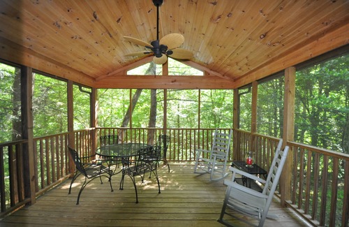 The atmosphere and location of this cabin provide the perfect getaway for a number of years now. Nestled into the trees and well off the roadway, the privacy abounds. Townsend is a small town that is a gateway community to the National Park. To visit the area opens up the entire park to visitors. This cabin has a warm interior with a huge main living space and stacked stone fireplace. The french doors that lead to the screened in back porch add a bright and inviting outdoor living area to the already spacious interior. Most guests spend an abundant time on this porch year round!