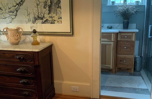 This private two-room suite has its own separate entrance in our one-of-a-kind 1915 cottage. Walk to and from town and then relax in the saltwater pool or take an outdoor shower. Enjoy the patio in peaceful privacy. We'll stoke the firepit for you on cool evenings. The rooms are decorated with our own and friends' original art. 100% cotton linens, french press coffeepot, mini fridge, smart TV are just a few of the comforts that make it homey. As an old conductor used to say as the train approached the station: "Try on your hat, Try on your coat, TRYON North Carolina!