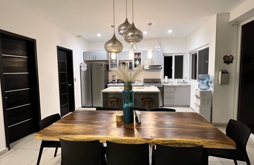 This luxurious house with a private pool is located inside Villa Oceanica which is a gated community with 24hr security and is one of the best areas in Costa del Sol. It’s 7 minutes walk to the beach. The house is 45 minutes from the airport and 1 hour to San Salvador. We have 4 tanning lounge chairs with umbrellas and a grilling area. There are two terraces with hammocks and ceiling fans one by the pool area & the other one on the second level for a beautiful view. Out door pool bathroom and showers to clean the sand off. There are 5 bedrooms with en-suite bathrooms and A/C units in each of them. Rooms are furnished with 1 king Bed, 6 Queen Beds, and 1 full over full bunk bed. In the spacious great room, you’ll find the living room, kitchen and dining room. There is only 1 TV in the entire house and it’s located in the living area. There is cable tv and WiFi. It has an amazing barbecue where you can grill. Kitchen is equipped for cooking or you can have food delivered to the house from restaurants near by. There is a local supermarket 15 minutes away if you want to buy groceries.