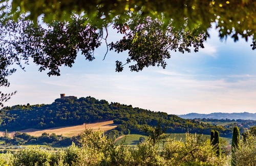 Villa Le 12 Querce, whose main building dates back to the 17th century, has undergone several renovations, the last of which was done by the architect Claudia Palazzetti in 1996, in accordance with the original design. The recent accurate renovation has recreated a warm and sophisticated atmosphere with a touch of the antique with its typical, exposed-beam ceilings and wooden, elegantly-hued floors. Immersed in the natural park of Monte San Bartolo, on the border between Emilia Romagna and Marche and only 5 minutes from the sea, the villa stands on a promontory overlooking the Marche-Romagna hinterland. The villa has two floors with a large, south-facing portico overlooking the pool. Of particular note is the large terrace on the first floor with a beautiful view of the castle of Gradara.
