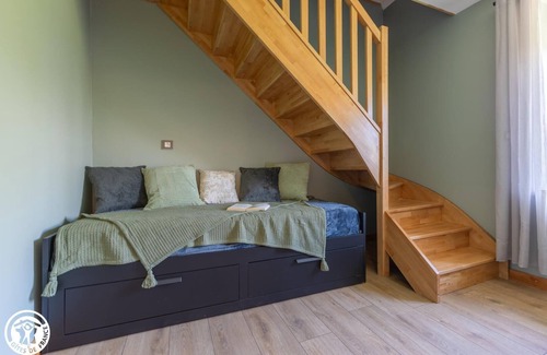 Located in a peaceful and green setting, this cottage is perfect for your reunion with family or friends! Outside, you will find a terrace ideal for al fresco dining and relaxing moments, as well as a garden where you can relax and enjoy the surrounding nature. Inside, the living room is characterized by beautiful exposed beams, combining rustic charm and modernity. The kitchen includes everything needed to prepare delicious meals using modern, high-quality equipment. The large dining table will be ideal for your convivial meals near the pellet stove, creating a cozy atmosphere in winter. The cocooning lounge will be the perfect place to relax while listening to music or playing a board game with others. As for the rooms, they are tastefully decorated, true havens of peace offering optimal comfort. The icing on the cake: the covered jacuzzi, installed in the old bread oven, which offers a unique space for moments of total relaxation. For even more relaxation, you can also enjoy the spa bath. This cottage is the ideal place to spend an unforgettable vacation, whether to relax, explore the region or simply enjoy precious moments with your loved ones. The cottage is composed on the ground floor: -a kitchen with standing eats open to the dining room with pellet stove -a cocooning lounge -a laundry room with everything you need -a separate toilet with hand basin Upstairs: -a bedroom/office with a 2x80 trundle bed -a bedroom with a 160 bed -a bedroom with a 160 bed -a bathroom -a bedroom with two 80cm beds that can be joined together -a bedroom with two 80cm beds that can be joined together -a bathroom/bath with shower and spa bath -a separate toilet with hand basin electric charging station