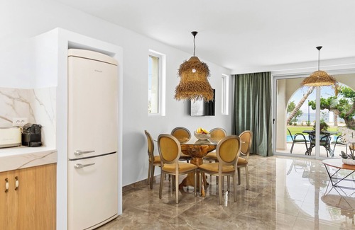 Outdoors, each villa boasts a private pool, surrounded by sunbeds, parasols, and comfortable outdoor furniture, ideal for relaxing or dining al fresco. Just steps away lies Charaki Beach, offering breathtaking sea views and the soothing sound of the waves. Le Palme Beach Villas seamlessly blend beachfront luxury with the comfort of home—making them the perfect setting for your Rhodes getaway.