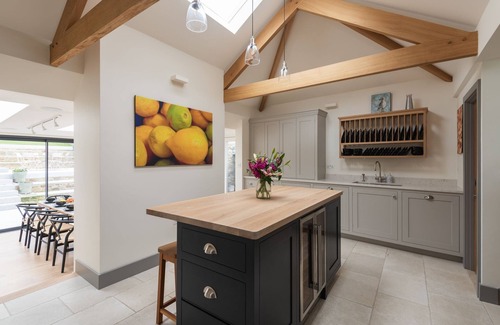 The main living areas flow beautifully through the house, starting with the sitting room that has comfortable sumptuous sofas, a wood burner to keep warm in the evenings and a large TV with sound bar. This leads down to the well-equipped kitchen with its high apex ceiling and wooden beams. Double dishwashers makes entertaining that little bit easier, and a good sized drinks fridge helps with the all important chilled bottles of wine.