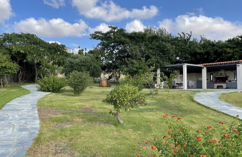 Villa surrounded by a beautiful garden, located just 250 meters away from the beach. The quiet and peaceful environment of the villa itself and the nature of the area, makes the experience ideal for relaxation.
