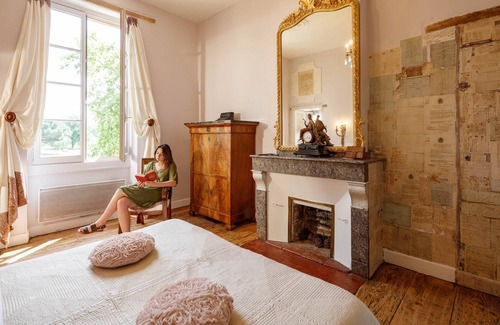 One of the walls of the room is covered with old letters of the nineteenth! You will find in this romantic room a bed 2 places (180cm x 200cm), a fireplace, a desk, an oak floor of the nineteenth, a private bathroom with toilet, sink and shower. For a natural stay with a breathtaking view on the park ...