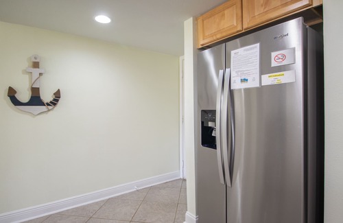 Newly painted with a soft relaxing yellow, the nautical theme of blue and white is accented with touches of red. A new king bed and new furniture in a lot of the rooms, all add to the open space and lightness of this poolside condo. There are nautical and beach themed canvas art throughout the condo.