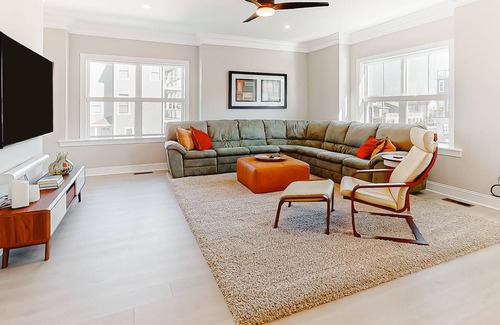 This spacious and light-filled three-level end-of-group townhome is modern and nicely appointed. There are four bedrooms, including two primary suites and a bunk room. On the second floor, the kitchen, dining room, and family room with a 55" TV are open concept and make a wonderful family gathering space. There is a well-equipped kitchen with a breakfast bar and stainless steel appliances. Also on the second floor is a living area with a 70" TV and a powder room. There are three balconies and a fourth-floor rooftop deck.